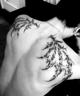 he stands tall at 6 feet 4 inches, two silver hooped snake bites etched into his lower lip, matching the piercing on his right eyebrow and a frenum bar, few are lucky to get the chance to see.tattoos adorn and sleeve both of his arms, a sigilism tattoo inked in black on the back of his neck that connects to the mark of skeletal wings on his latissimus dorsi muscles.his hair jet black and curly frames his face when he gives it the chance to grow out, reaching just above his shoulders.his eyes a shade of deep crimson red, almost passing for dark brown, which glow when his emotions are heightened- positively and negatively.when he walks through the doors of his rather large home, enchantedly cursed with a spell that causes it to be unseen to normal eyes, a pair of sharp black horns appear perfectly symmetrical on the top of his head, exceptionally sharp fangs replacing his regular canines and with every full moon, his hellhound form takes over as he finds himself lurking in the never-ending abyss of trees just outside his home.